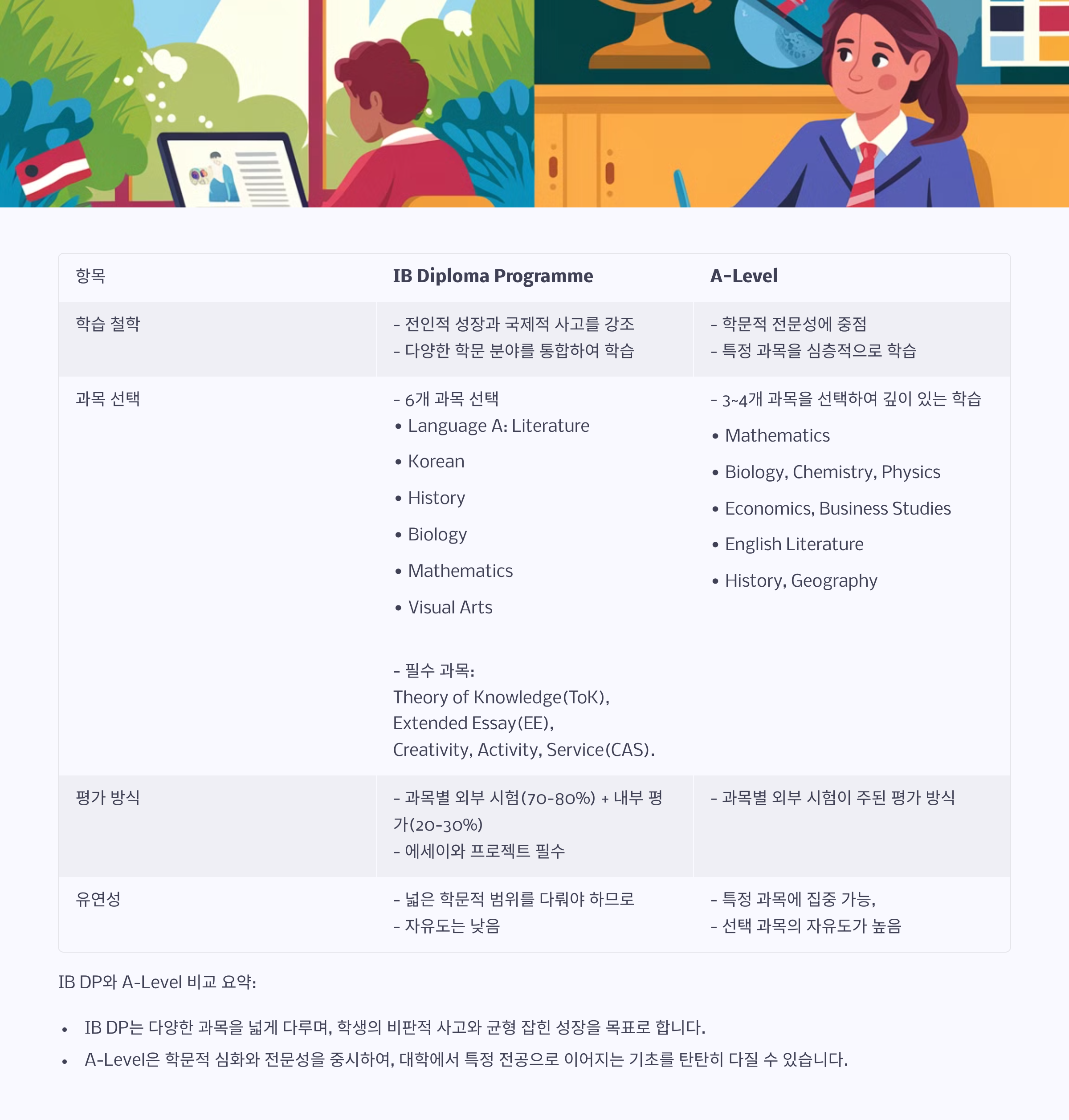 해외 대학 진학을 준비하거나 글로벌 경쟁력을 키우고 싶은 학생이라면, IB(International Baccalaureate), A-Level(General Certificate of Education Advanced Level), AP(Advanced Placement) 중 하나를 선택해야 합니다.