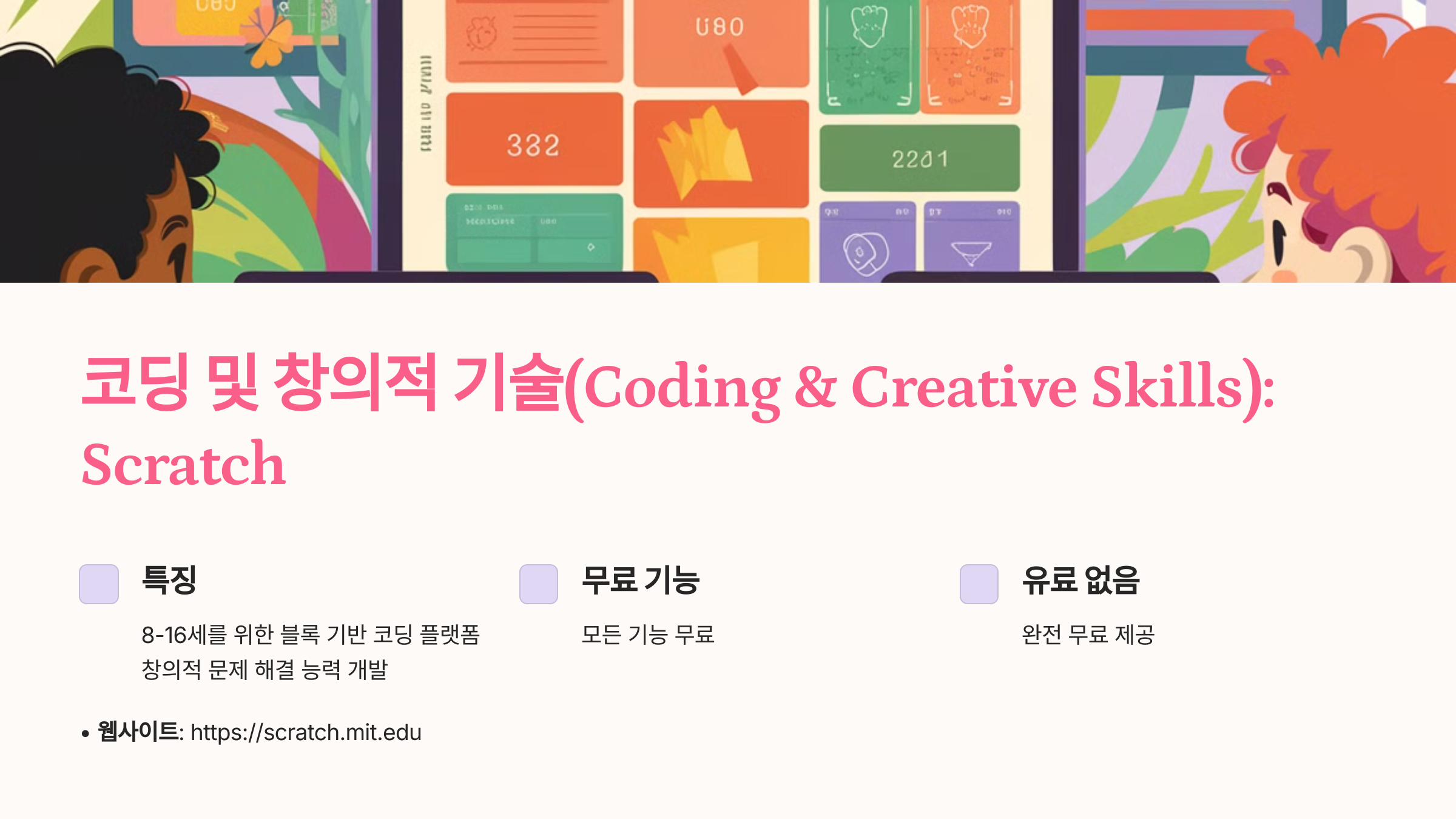 Scratch와 TypingClub 같은 무료 플랫폼은 부담 없이 시작할 수 있고,