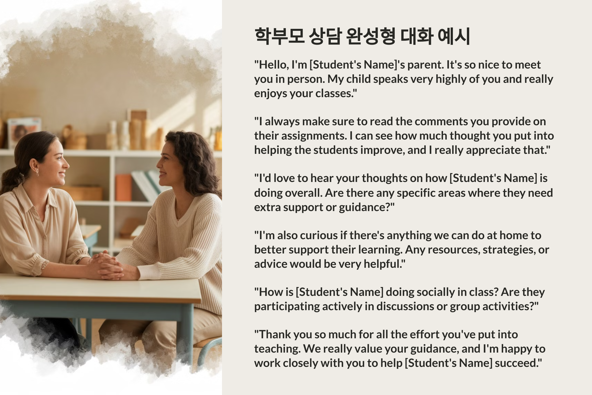 → 선생님에 대한 긍정적인 피드백으로 대화를 시작하세요. -> 누구나 좋아하는 이 말! 😊