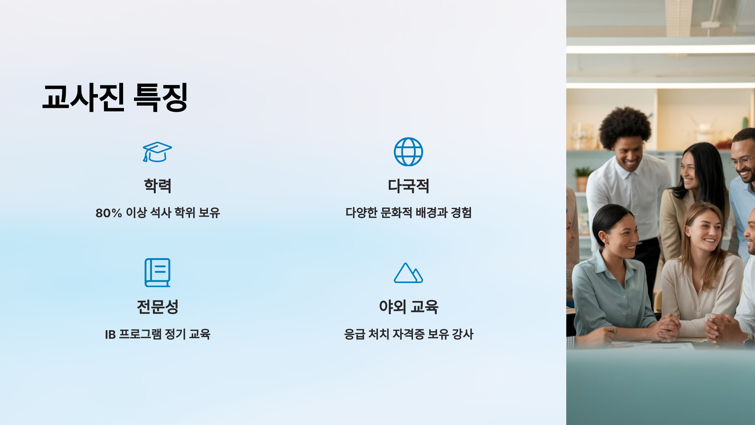 • 다국적 구성: 다양한 문화적 배경과 국제적 교육 경험을 가진 교사들이 다문화적 환경을 조성합니다.