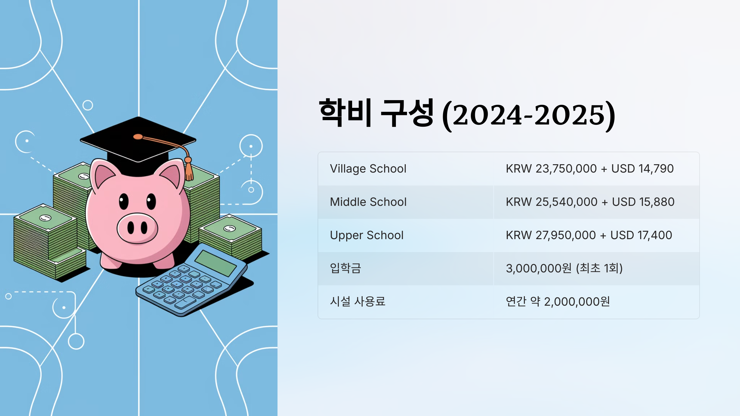 • Village School (초등): KRW 23,750,000 + USD 14,790