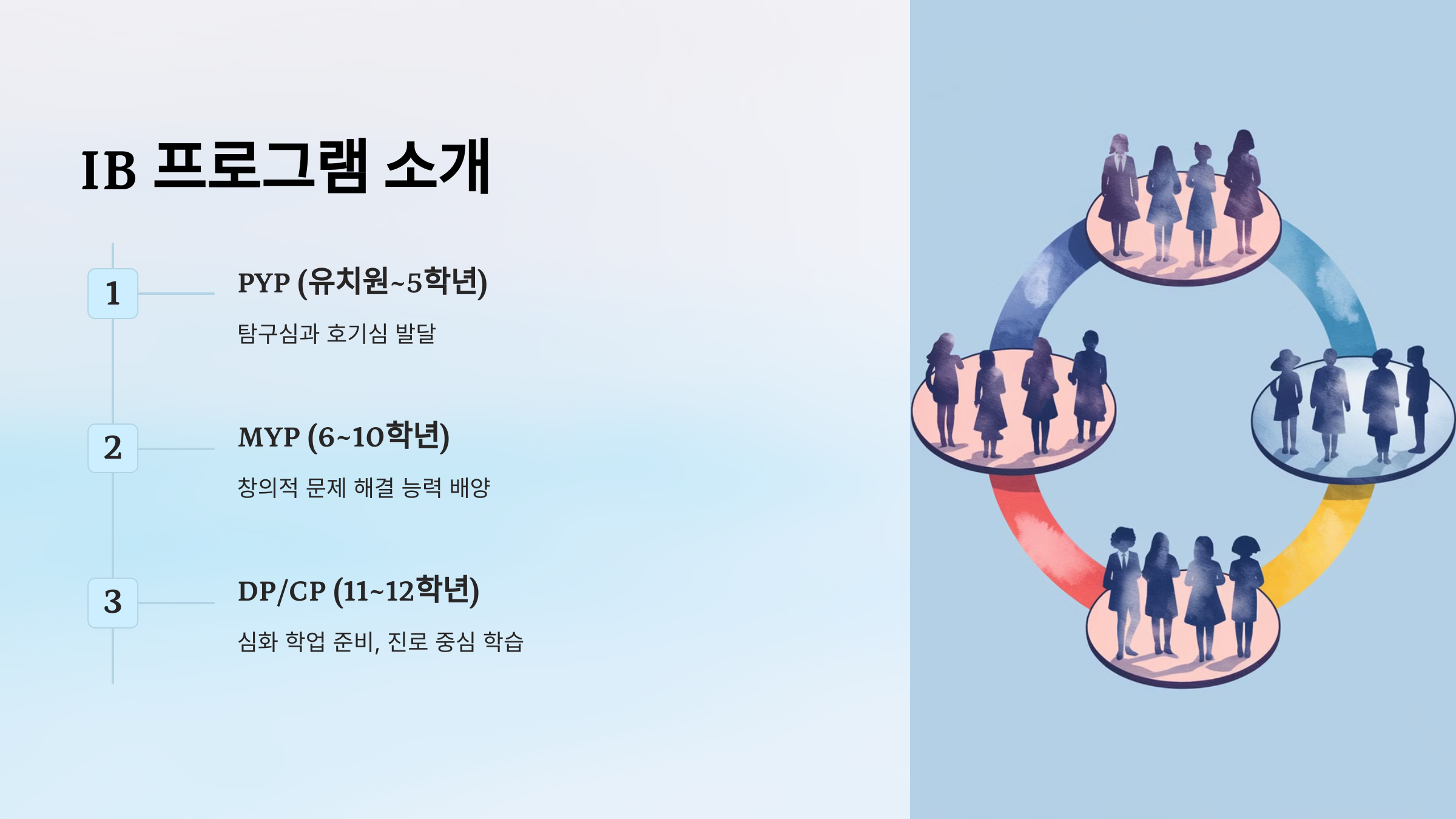 • DP/CP: 11~12학년 (심화 학업 준비 및 진로 중심 학습)