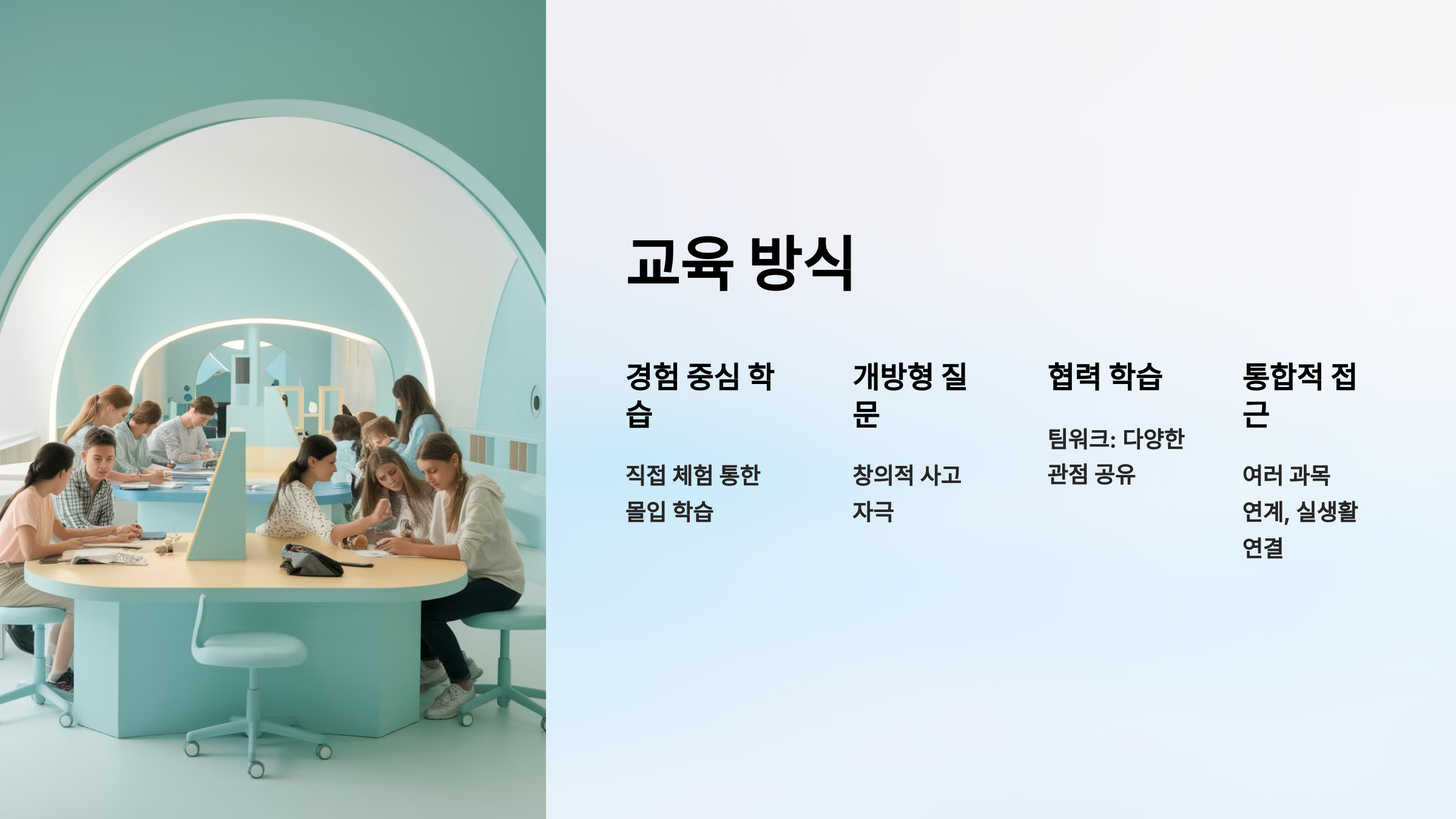 • 경험 중심 학습: 학생들이 직접 체험하며 학습에 몰입할 수 있도록 돕습니다.