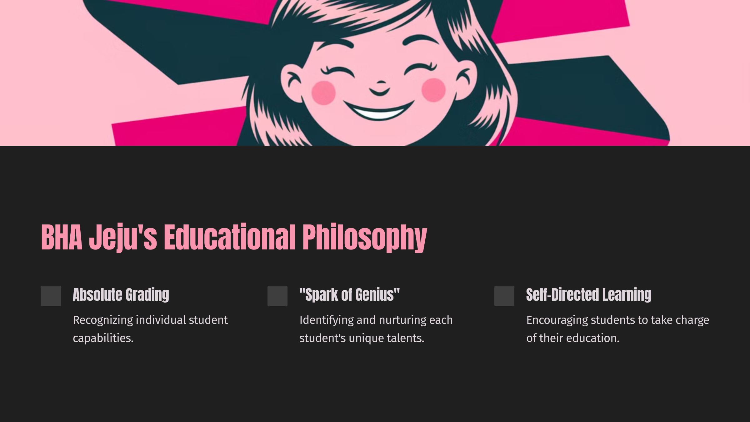 BHA Jeju는 IB 연속 교육과정을 제공하는 학교로, 아이들이 비판적으로 사고하고 창의력을 키울 수 있는 환경을 잘 갖추고 있고,