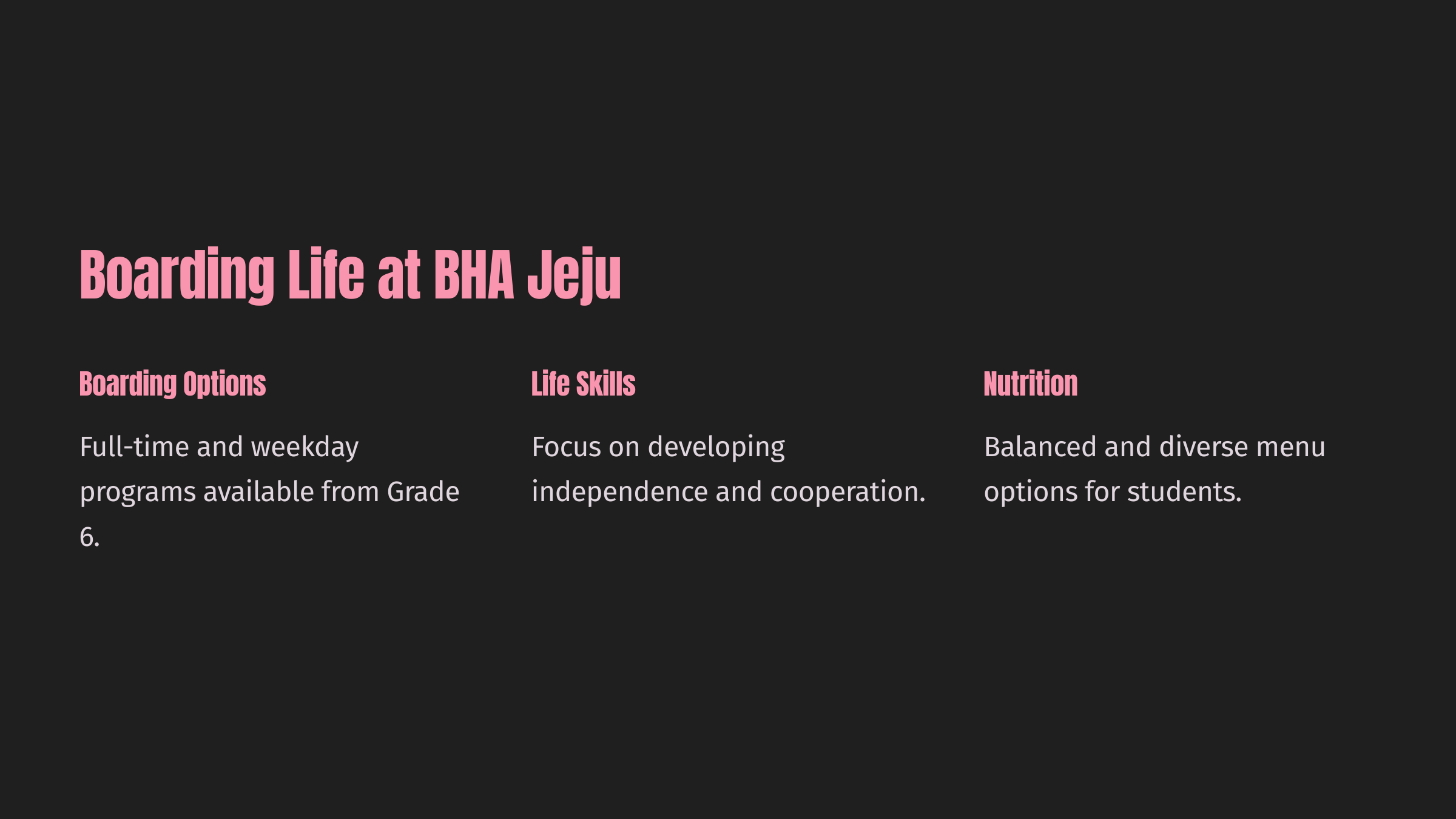 • 위치 및 특징: BHA Jeju는 제주도에 위치한 국제학교로, 전 교육과정을 IB(국제 바칼로레아)로 운영합니다.