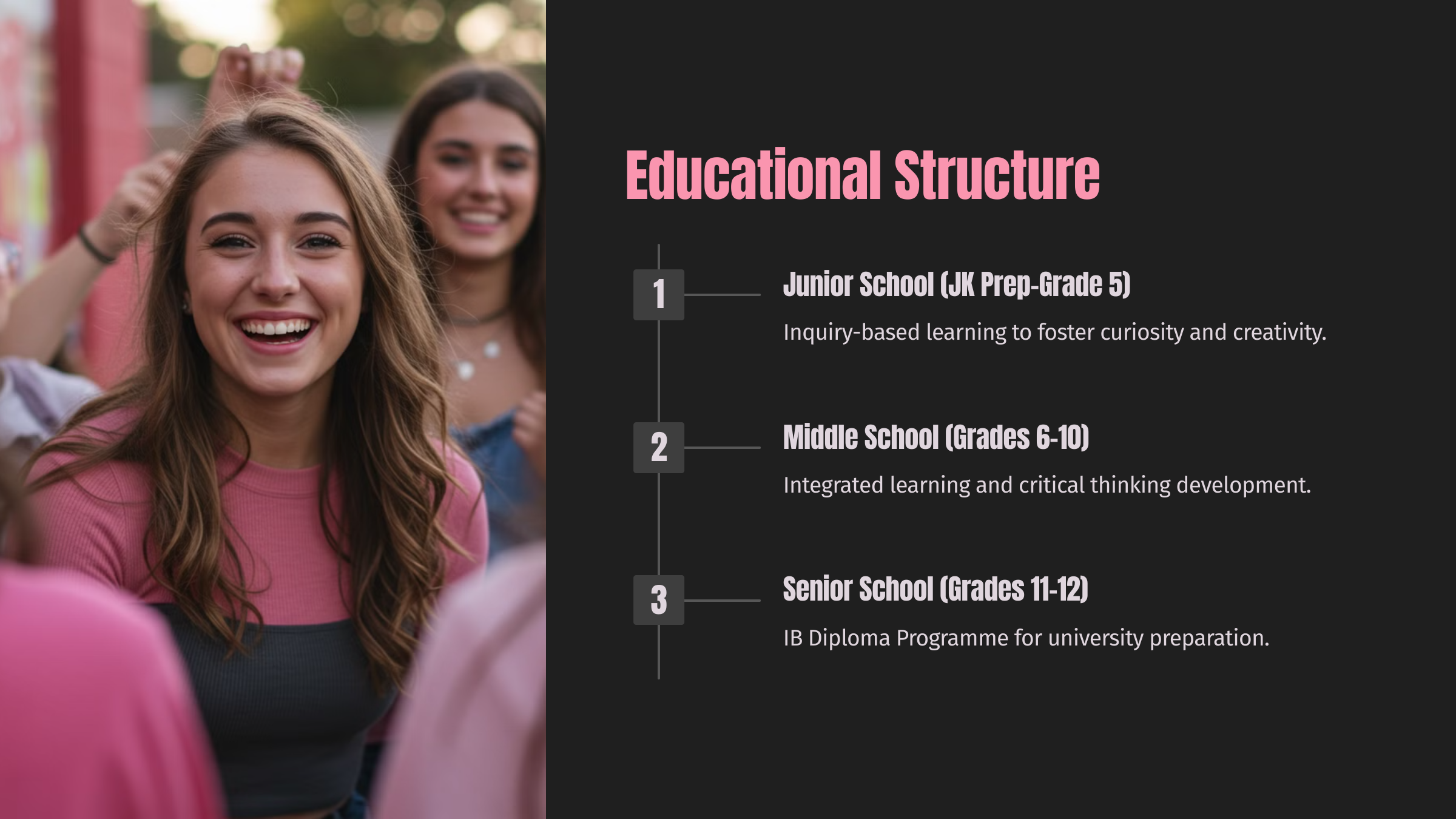 • 시니어 스쿨 (11~12학년): IB 디플로마 프로그램을 통해 대학 진학을 준비합니다.