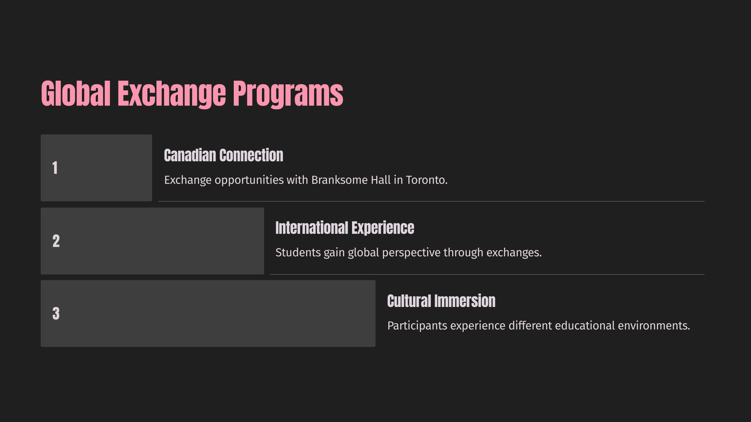 • 캐나다 본교와의 교환학생 프로그램을 통해 국제적 경험 제공.