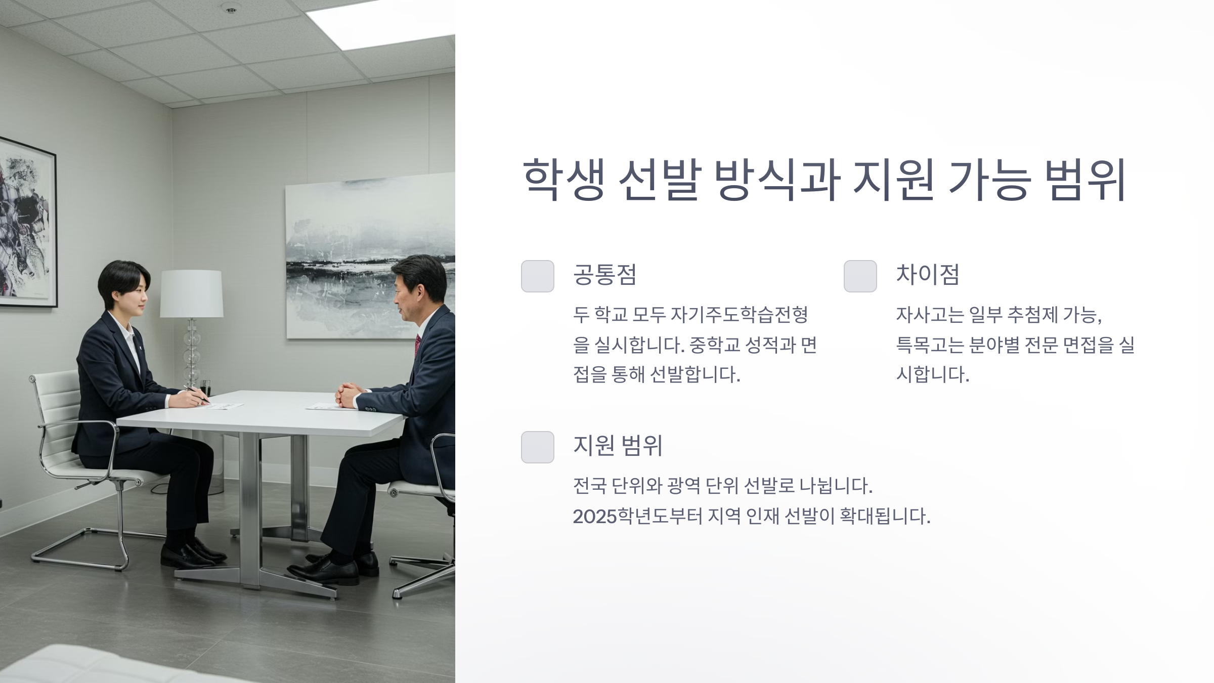 • 자사고: 일부 학교는 면접 없이 추첨제로 선발 가능