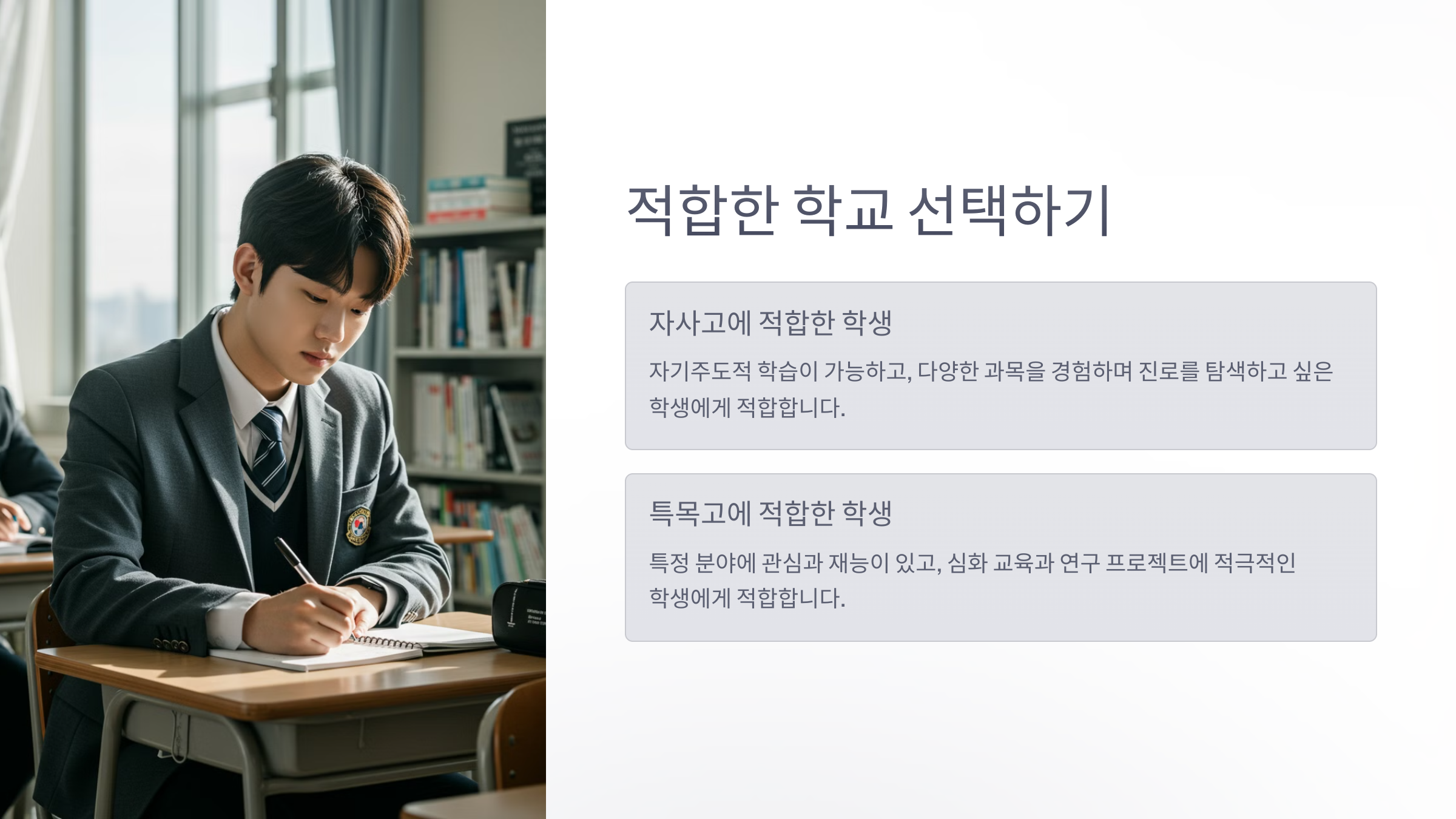 고등학교 선택은 단순히 학교의 이름값이 아니라, 아이가 자신의 적성과 꿈을 펼칠 수 있는 곳을 찾는 과정입니다.
