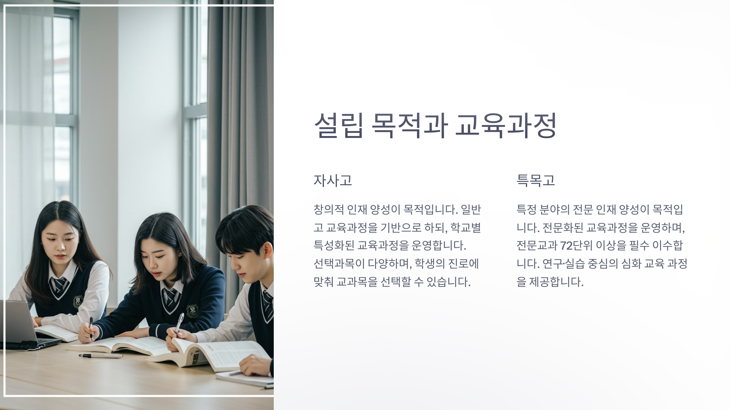 • 전문교과 72단위 이상 필수 이수 (예: 과학고는 수학·과학, 외국어고는 외국어 수업 비중 높음)