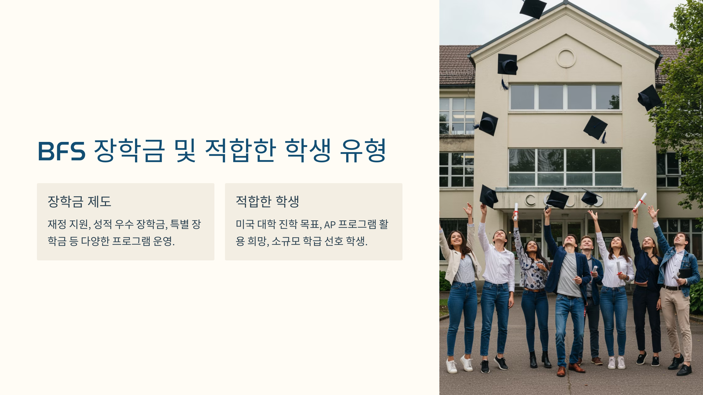 부산외국인학교(BFS)는 미국 대학 진학을 목표로 하는 학생들에게 특화된 교육 환경을 제공합니다.