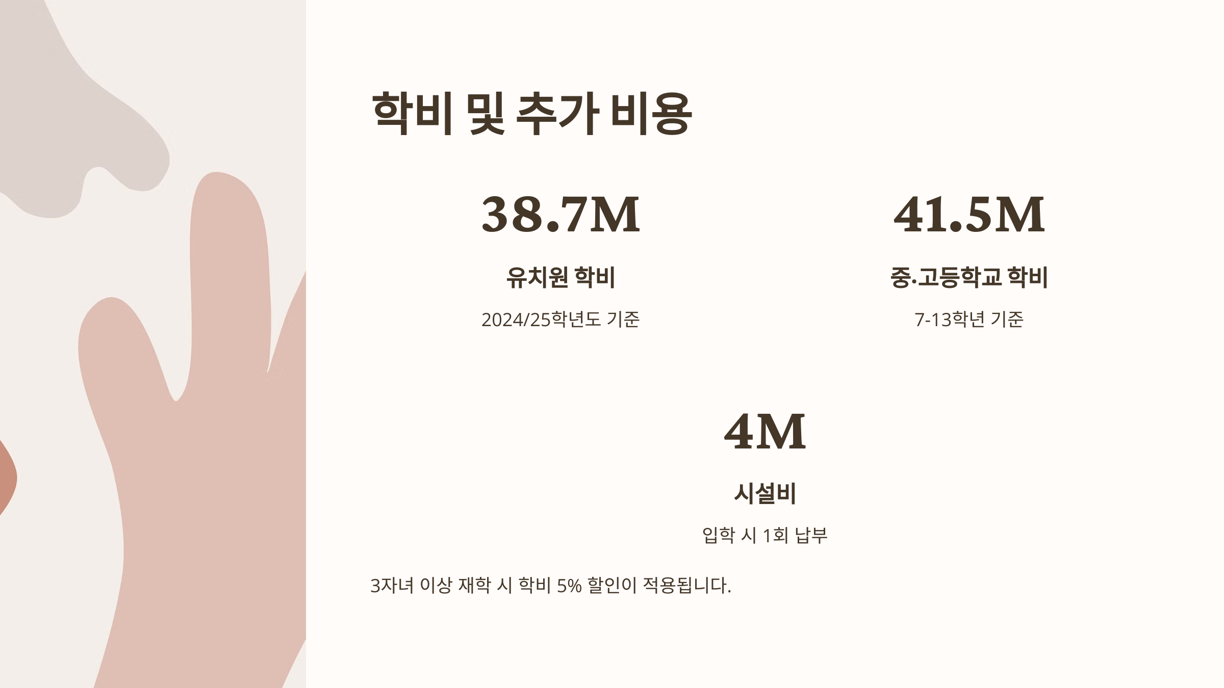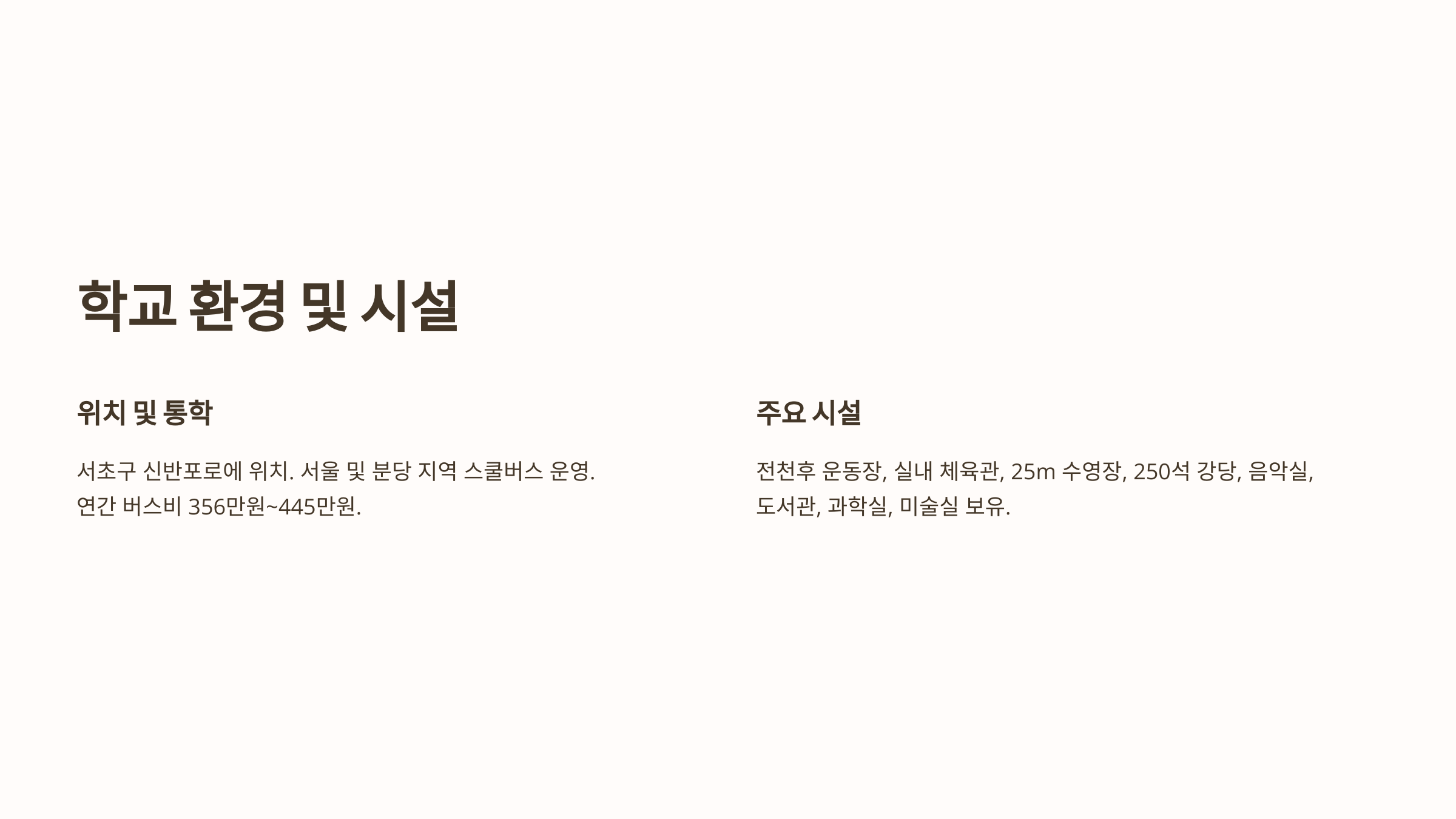 • 서울 및 분당 지역으로 스쿨버스를 운영하며, 연간 버스비는 356만원(편도)~445만원(왕복) 수준입니다.