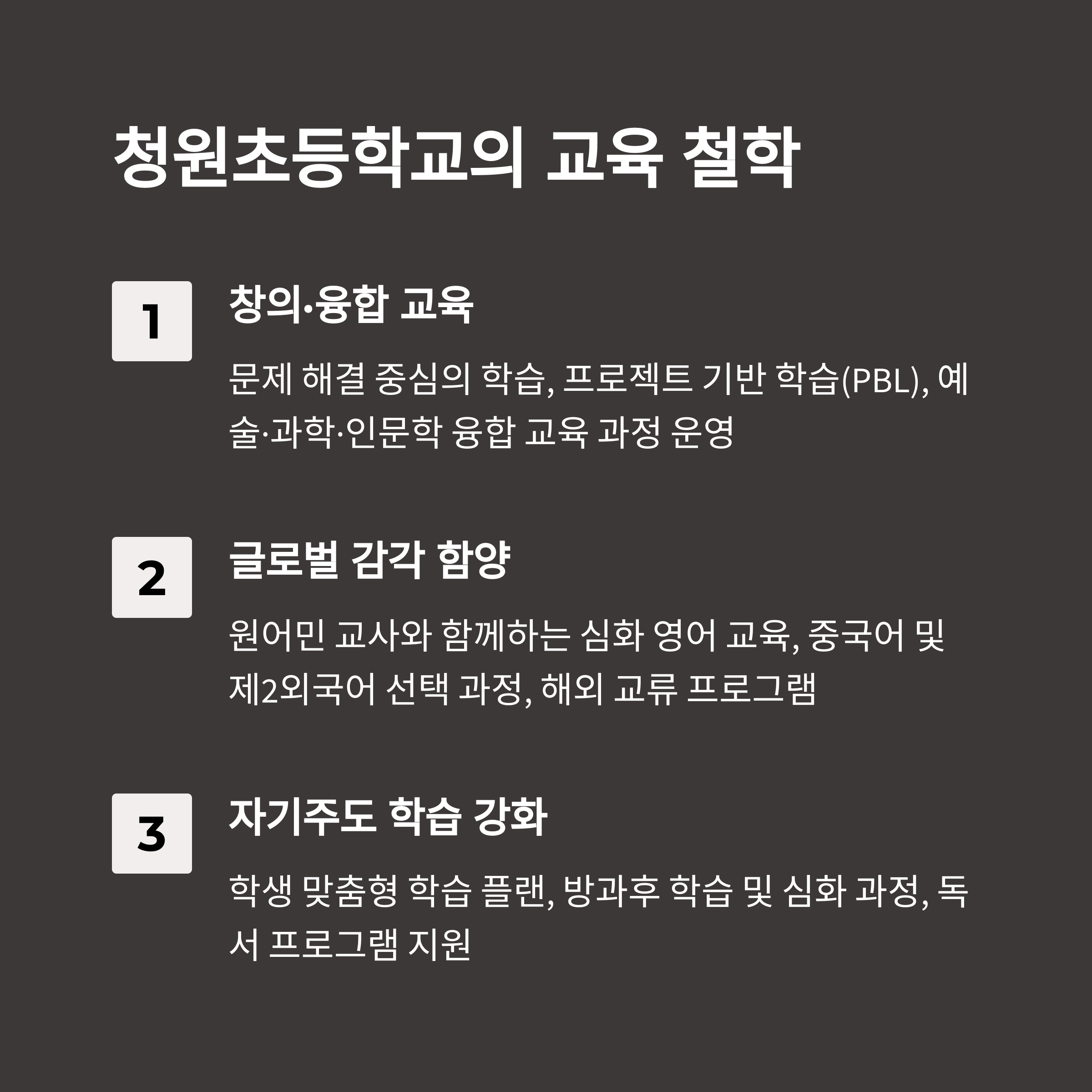 서울 노원구에 위치한 청원초등학교는 창의적인 글로벌 인재 양성을 목표로 하는 명문 사립초등학교입니다.