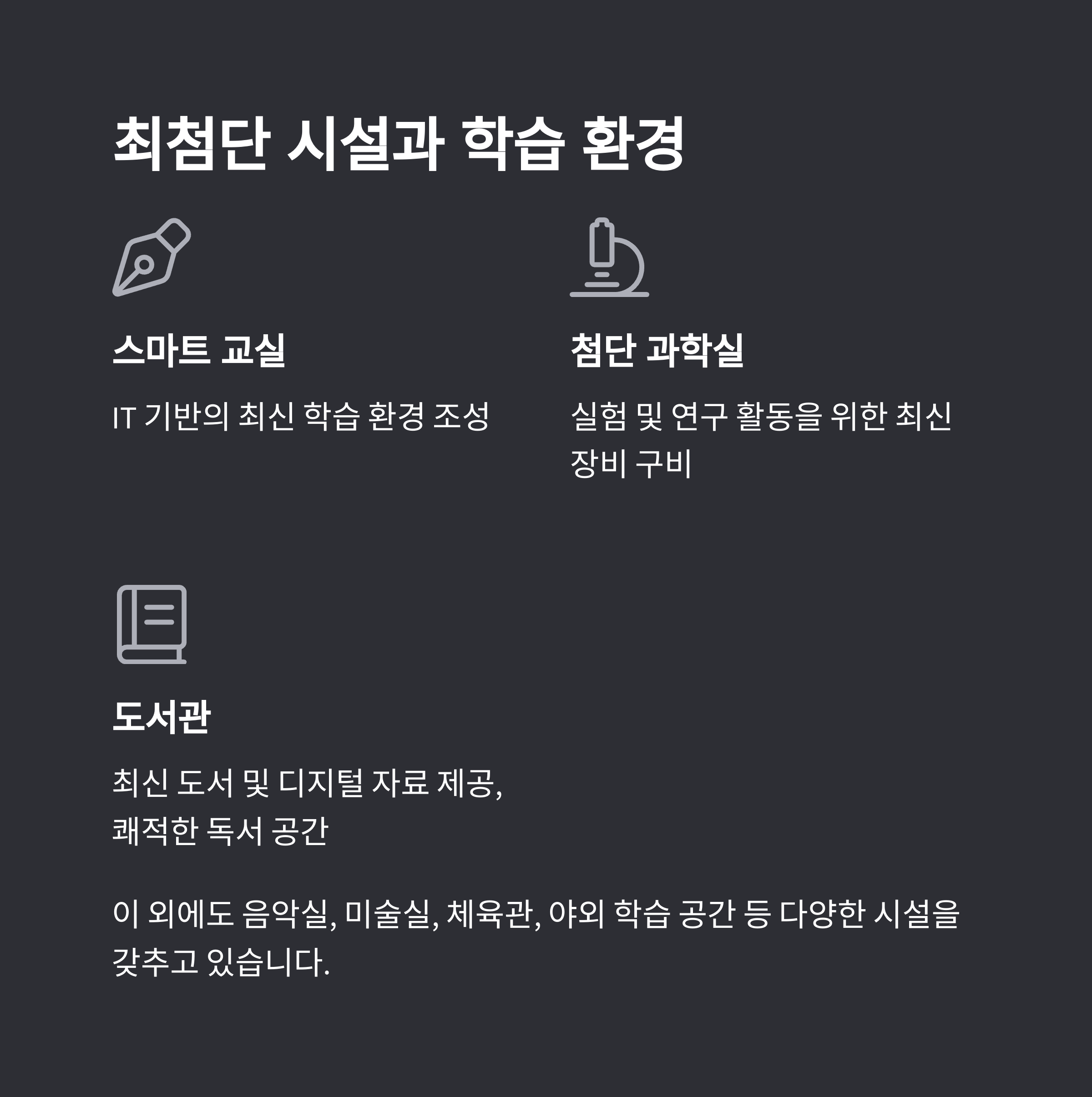 - 최첨단 교육 환경 제공: 스마트 교실 및 최신 IT 교육 시스템 구축, 안전하고 쾌적한 학습 공간 조성