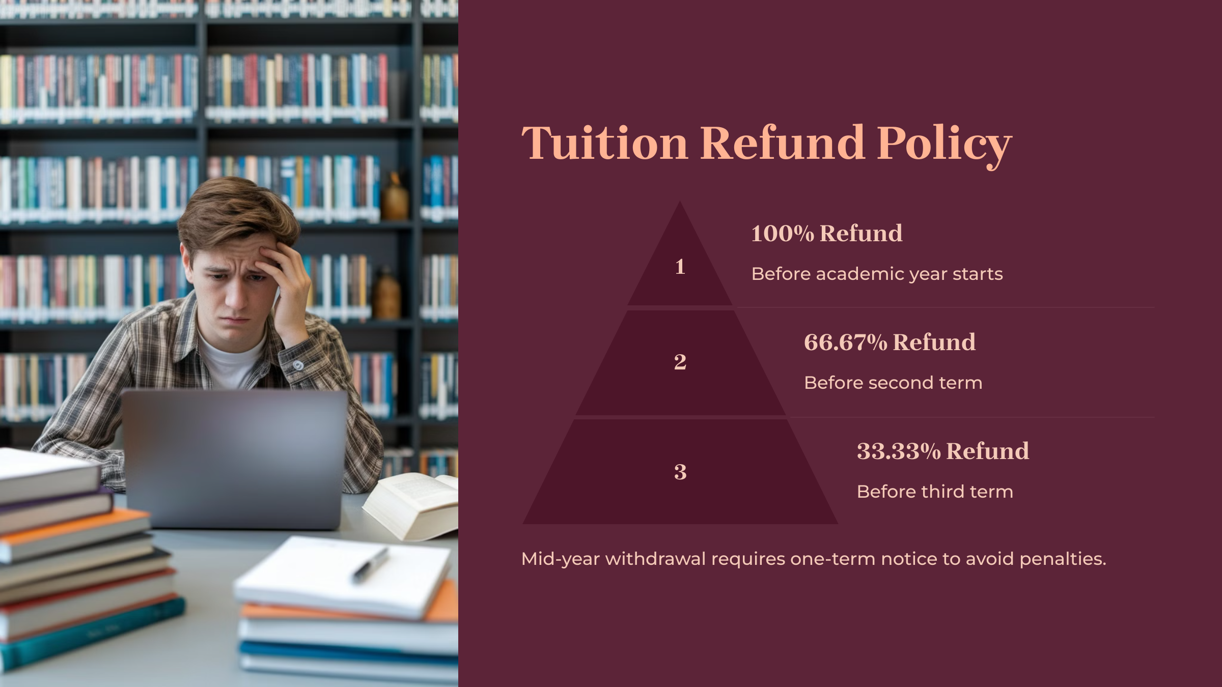 • 기숙사 비용: 연간 약 1,200만 원(KRW), 일시불 납부 시 2% 할인.
