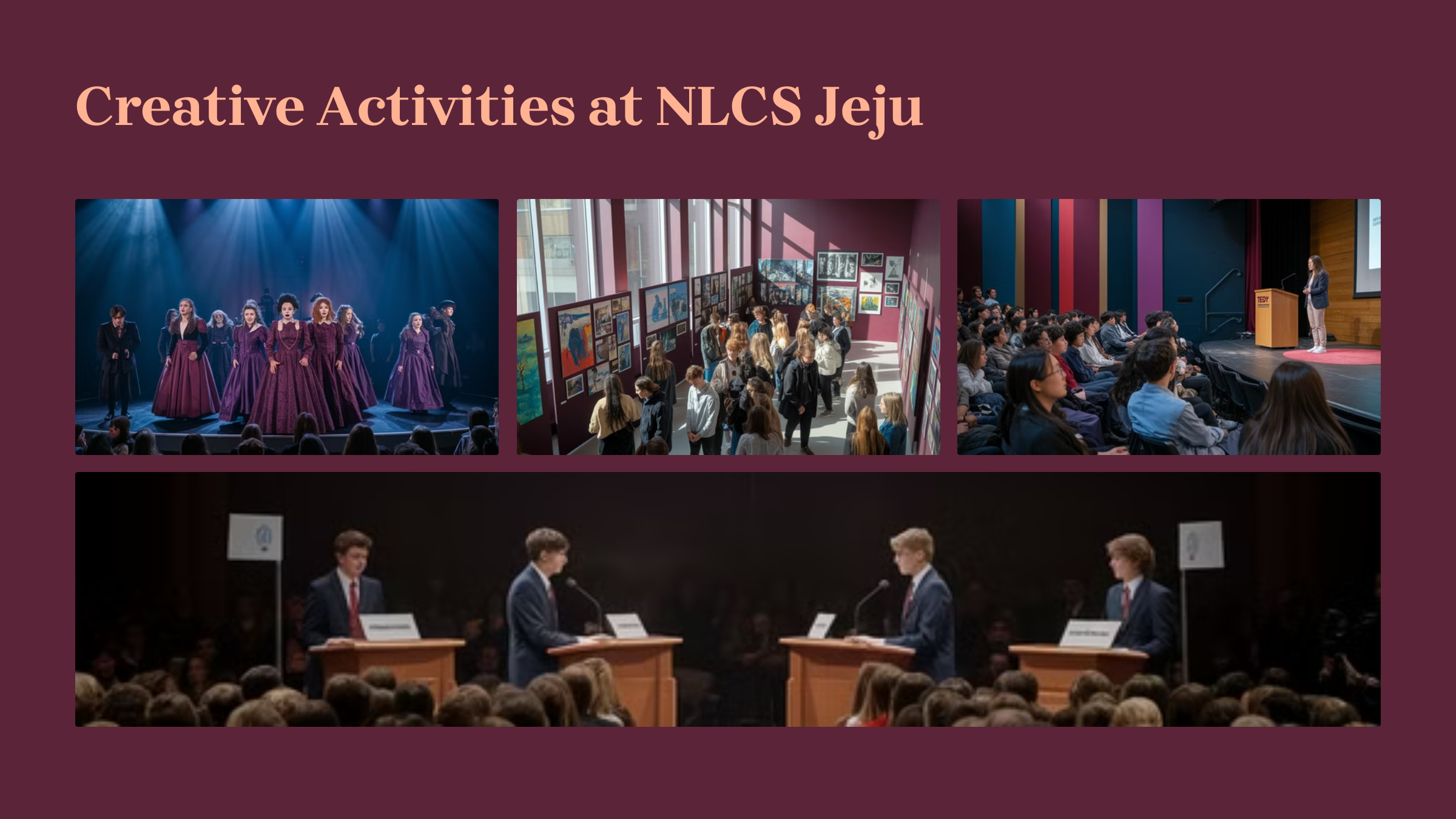 • 연극, 음악, 미술 프로젝트, TEDx 이벤트, 디베이트 대회 등 다양한 클럽과 활동을 통해 창의력을 발휘할 수 있습니다.