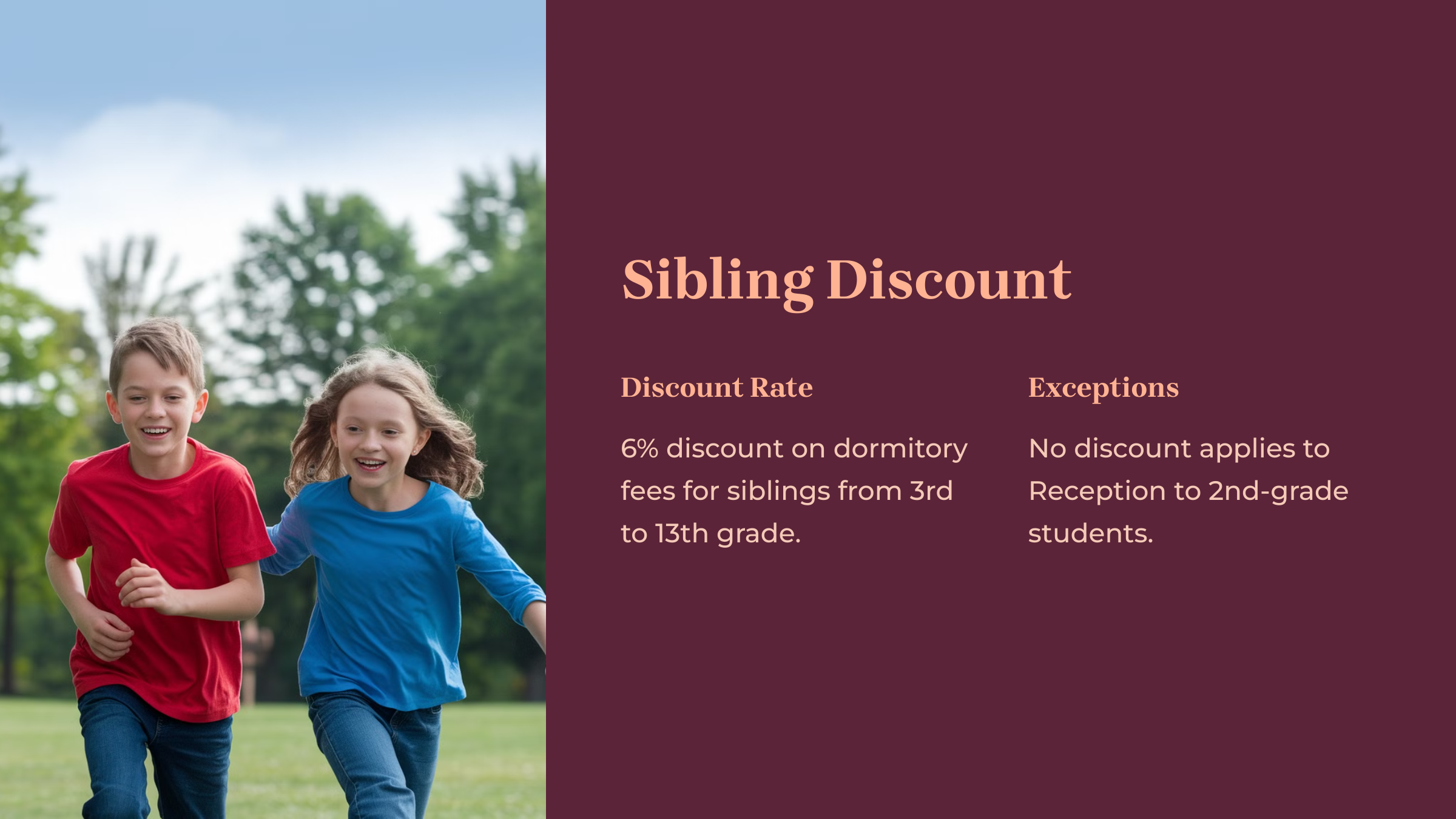 • 3학년부터 13학년까지 기숙사 비용의 6%가 할인됩니다.